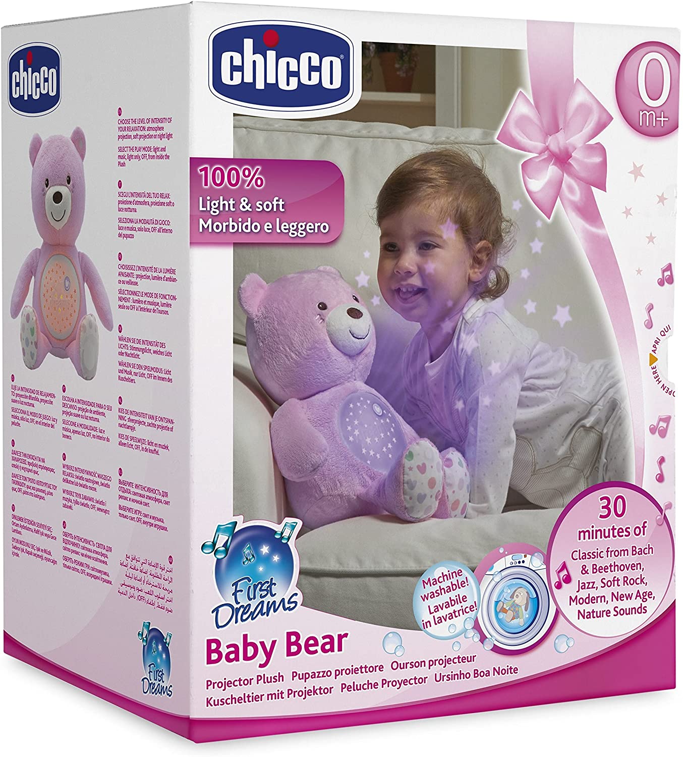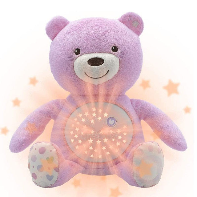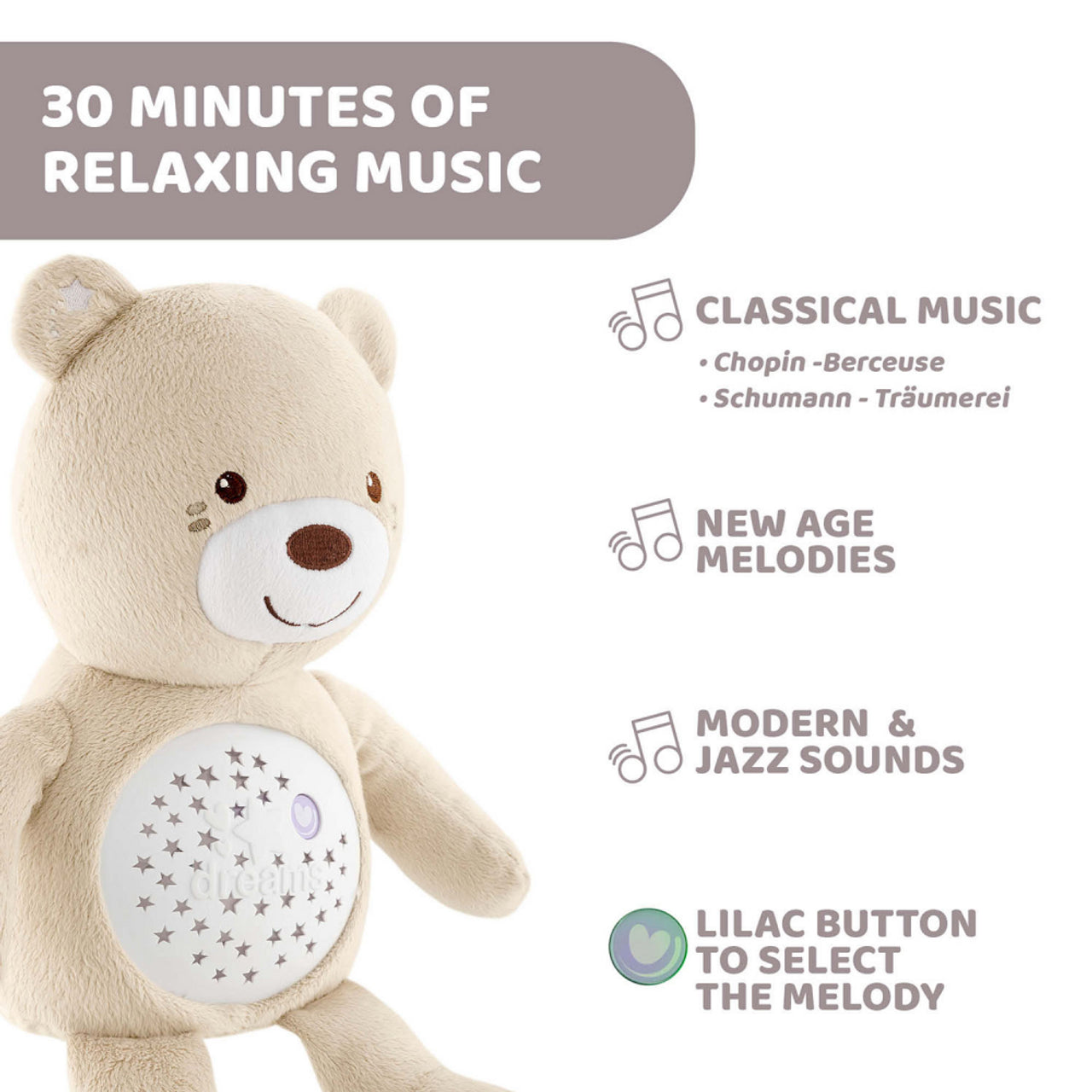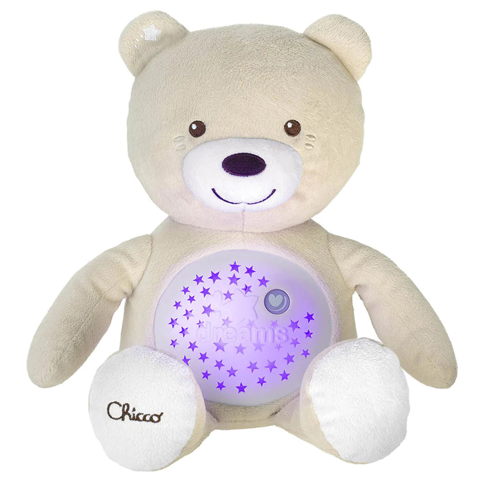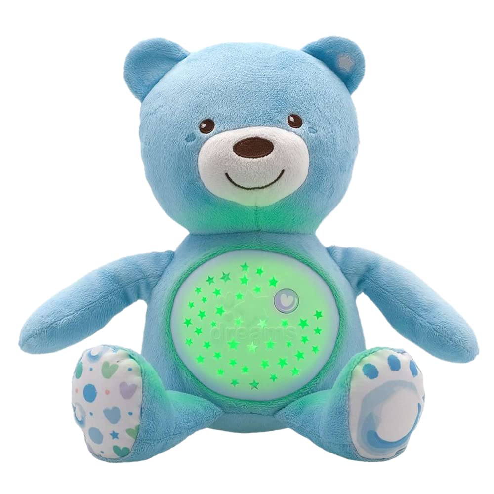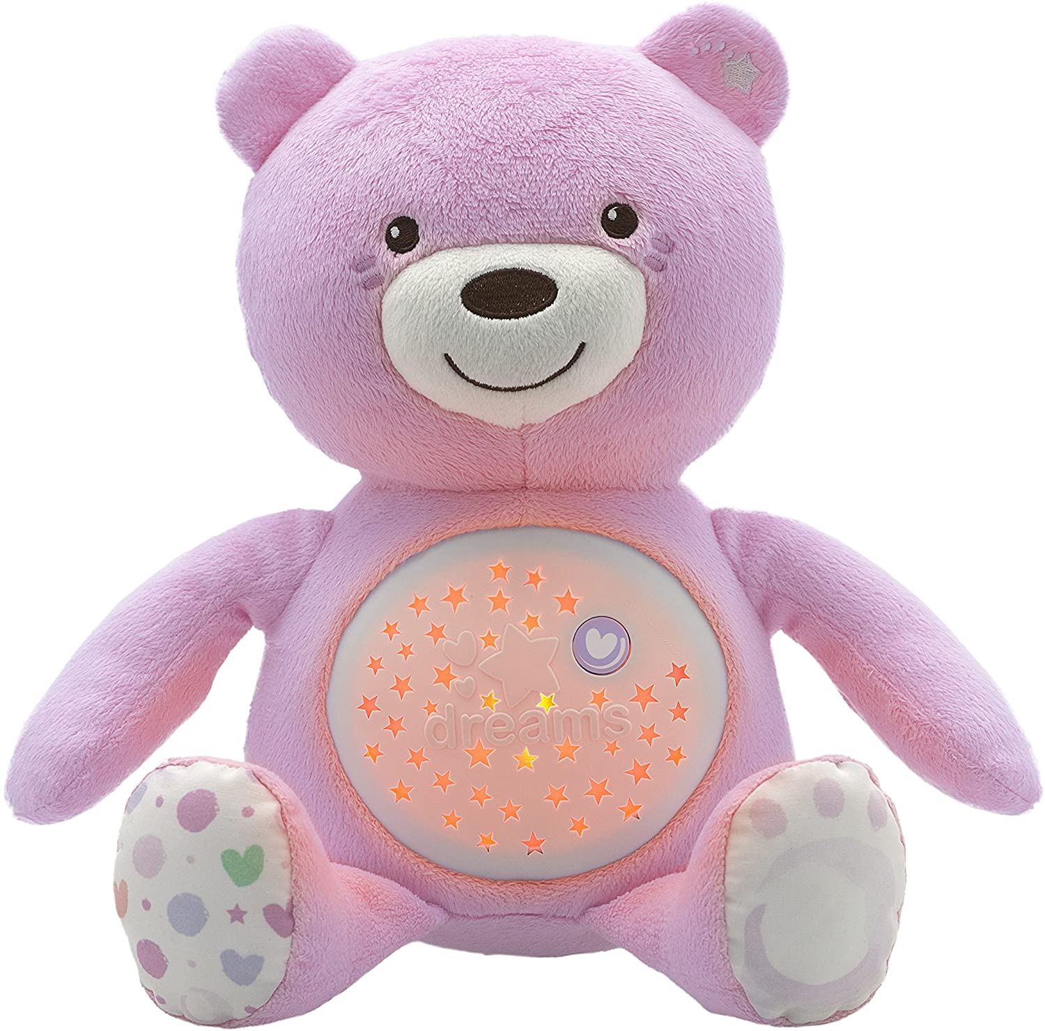 • يحتوي على زر ذو تأثيرات ضوئية ونجوم متحركة وألحان هادئة تساعد طفلك على النوم بسلام.