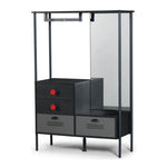 تصميم الكمود يتناسق مع باقي تصميم الغرفة المميز، وجوده مهم من أجل التخزين واستغلال المساحة التي يوفرها ويوجد أيضا مكان مخصص للمرآه وبشكل طولي مما يضيف لمسة أنيقة للغرفة. أبعاده: العرض 105 سم، الارتفاع 157، العمق 45 سم.