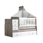 •It can be converted from a newborn crib to a child's bed until approximately 12 years old, with dimensions of 180/80. The swinging bed feature can be used when flipped to become a study desk. Also, the storage unit can be used as a desk drawers unit.